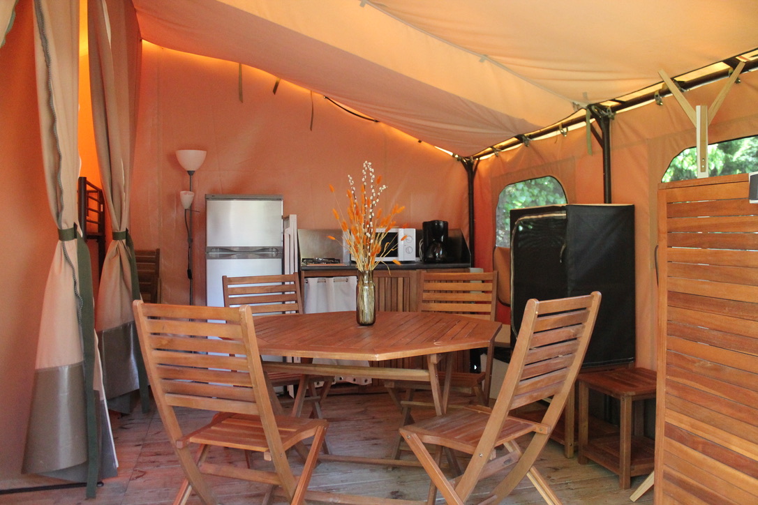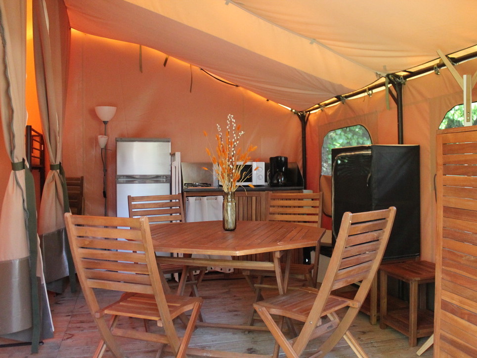 Les Lodges ont une capacité de 5 personnes, toutes équipées de lit et le nécessaire de cuisine comme une table à manger, une kitchenette avec un point de cuisson. Elles disposent également d’une terrasse privée, avec des chaises longues et un espace dédié au repas. Un sanitaire/douche se trouve non loin de l’espace Lodges.